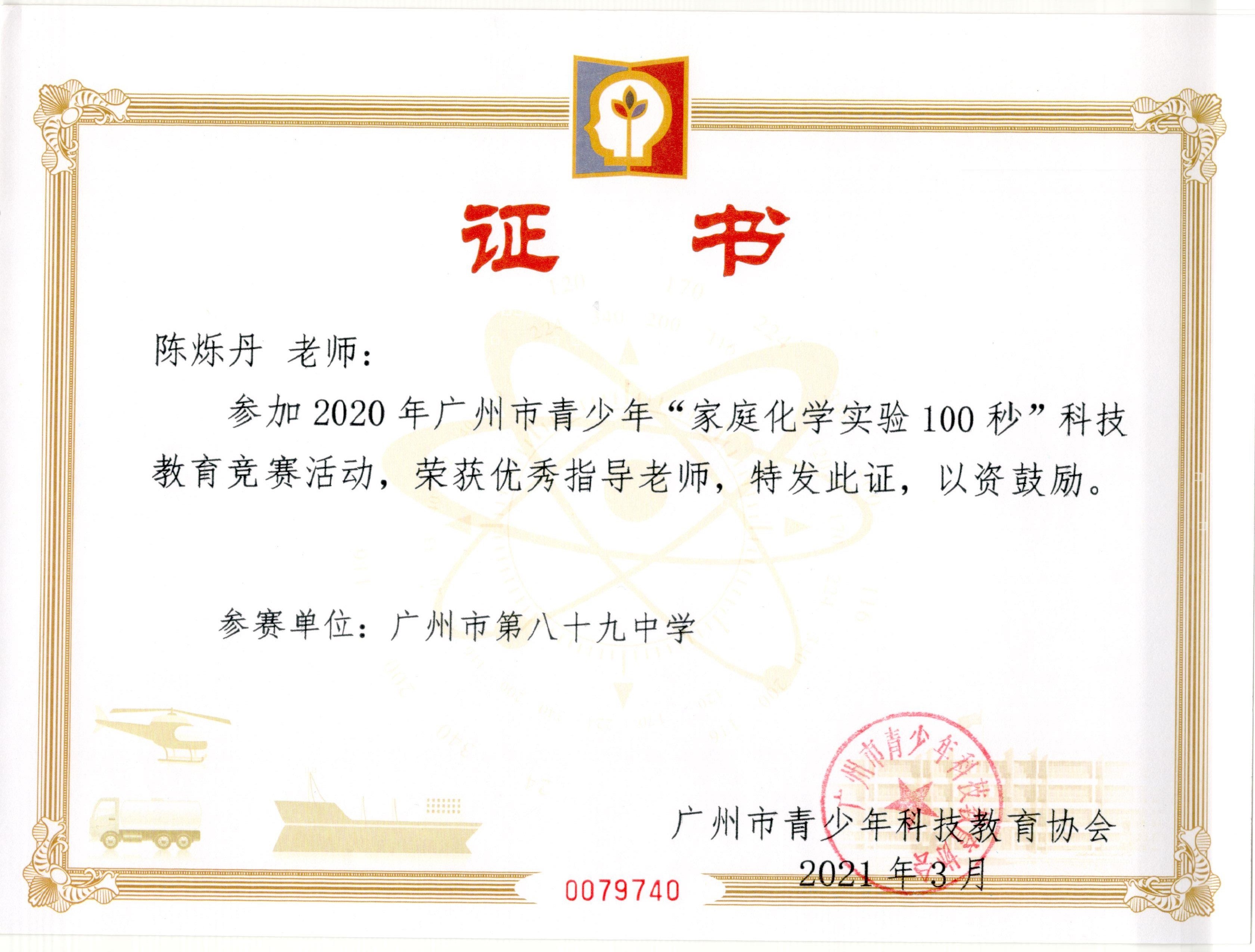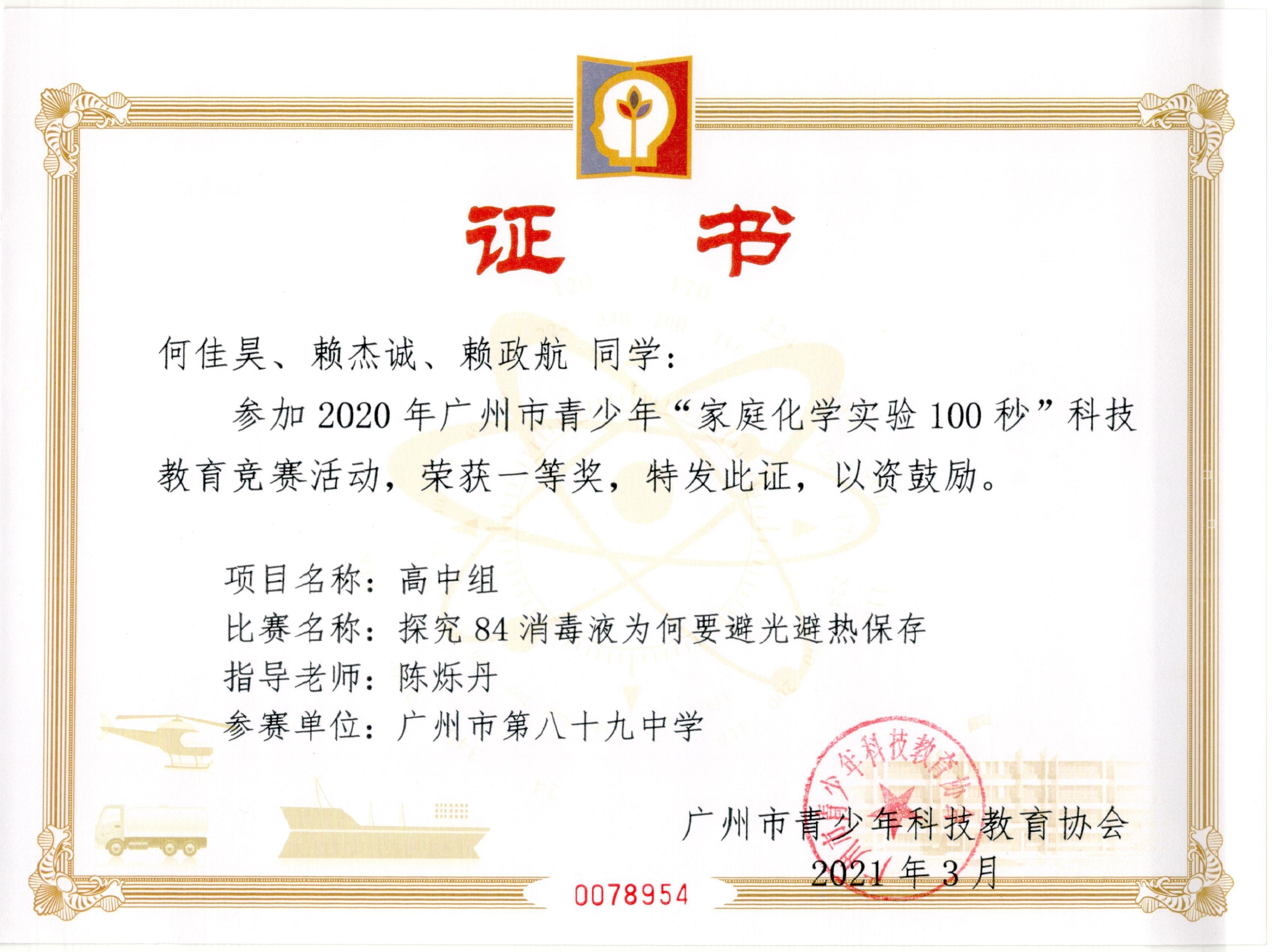 在2020年广州市青少年“家庭化学实验100秒”科技教育竞赛活动中,何佳昊、赖杰诚、赖政航的《探究84消毒液为何要避光避热保存》荣获一等奖(指导老师:陈烁丹);王玮琪、吴一涛、蔡林杰的《消毒剂消毒结果可视化》(指导老师:陈烁丹);汪阳光、侯淇耀、陈佳鑫、钟卓然的《抗疫的氧化剂》荣获二等奖(指导老师:车麦平)。陈烁丹老师被评为优秀指导老师。