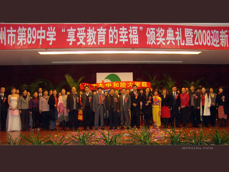 2007年12月29日,广州市第八十九中学“享受教育的幸福”颁奖典礼暨2008年迎新年联欢会在武警天鹿湖会议中心隆重举行。天河区政协副主席吴兰桂同志、区教育局长黄启林同志、局党委副书记符铁民同志、副局长徐江同志、副局长王芹同志、刘道军调研员以及教育局各科室领导与我校全体教职员工欢聚一堂,共同见证、分享89中幸福校园建设成果。