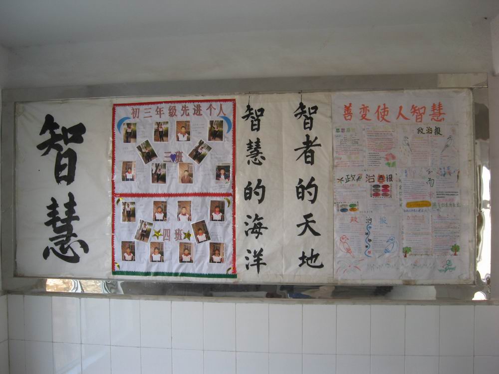 我们还参观了校园,听了高副校长的报告。我们观察到,杜郎口中学最有特色的是他们的课堂。所有学科都参与“三三六”的教学模式;老师与学生都充满自信;课室内外每一位学生都有自己展示的天地,因为教室三面全是黑板,再加上走廊上的一块,每人都能分一小块。不管是语、数、英还是史、地、生、物、化 、政,学生每堂课前都在黑板上写下自己的学习成果,字体是那么的工整,内容是那么的多样,写完后还互相评改,写建议,实在让人震惊。在老师的引导下,知识点的认识得到了巩固和加深,课堂的“自动生成”在这里得到了充分的体现。