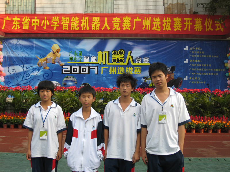 由广州市教育局、广州市青少年科技教育协会主办的广东省中小学智能机器人竞赛广州选拔赛于2007年10月20日在广州市第52中学隆重举行。本次比赛汇集了全市100多支参赛队伍,200多名参赛学生,可以说,100多支参赛队伍个个是由精兵强将组成,每个代表队的教练都有各自的绝招秘笈,每个队的队员都有自己的看家本领和与对方竞争的十八般武艺,个个都有养兵千日用在一时―――志在必得的心理期望,确切说是雄心壮志。特别是一些省、市重点中学的代表队更是显得那么的自信有把握…这是一场没有运动场上的硝烟(发令枪的硝烟)、没有运动场上呐喊助威的一场智力、心力、毅力的比拼!不亚于运动场上的激烈竞争,也可以说是有过之而无不及!可谓是精英云集,个个跃跃欲试!