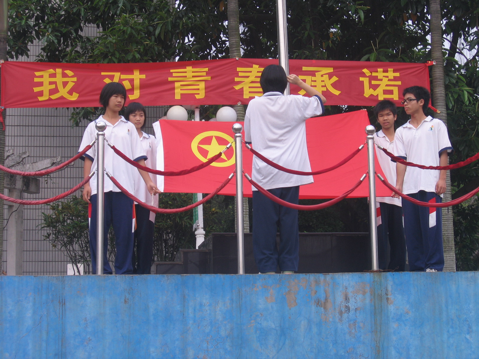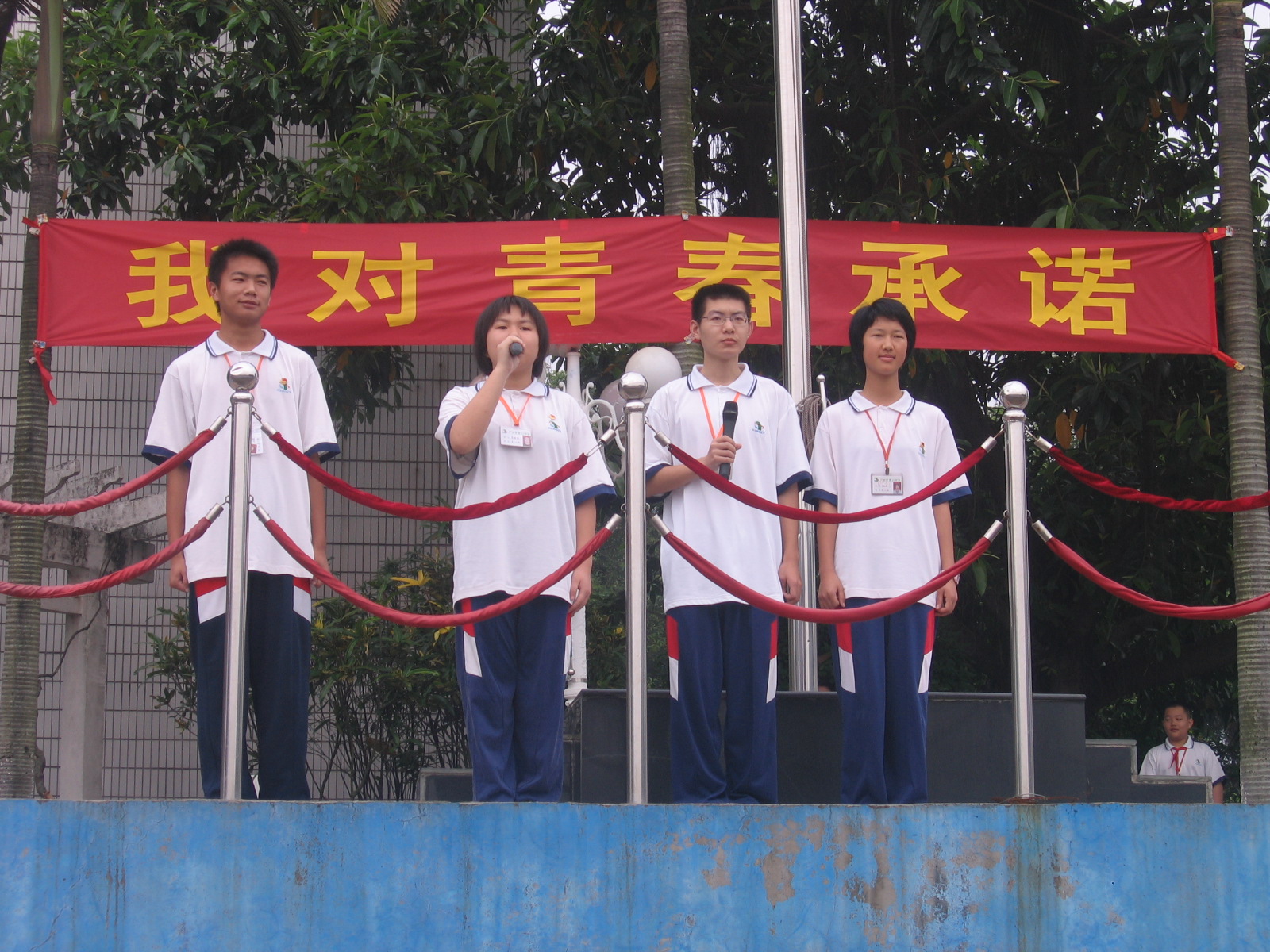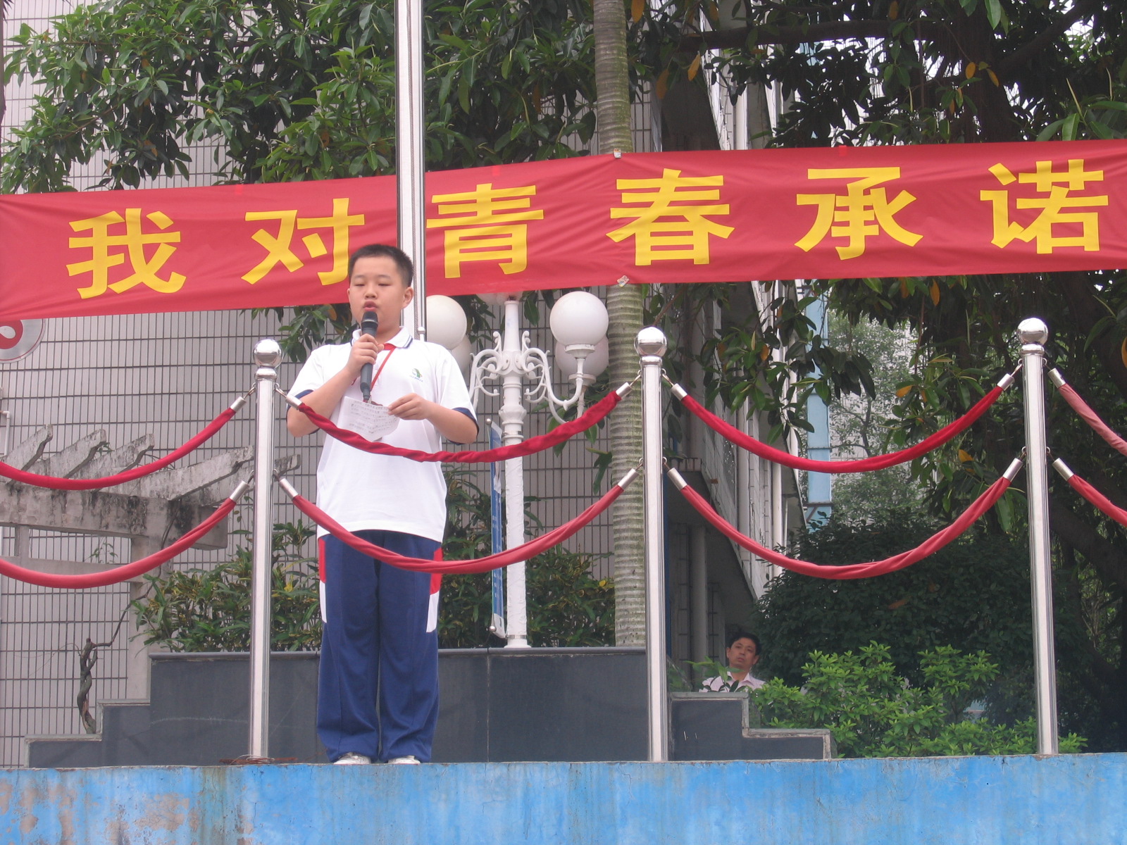 初一(8)班陈明俊同学代表少先队员向步入青年时代的师兄师姐以及年青教师献辞,他说像他这样的少先队员是多么期待自己的青年时代的到来,一看到校团委组织青年团员开展了丰富多彩的活动,他就有股要快速长大的冲动,恨不得明天就能加入青年队伍中去。最后他衷心祝愿青年哥哥姐姐们节日快乐,也希望他们能够快速成长,早日成才,为国家、为社会的发展贡献一份力量。青年代表蒙嫣嫣等同学用朗诵的形式表达了自己的心声,青年学生们用汗水、自信、勇敢、机智奏响着自己青春的旋律。毛泽东同志曾说过:“青年就是早上八、九点钟的太阳”,相信现代青年能够担负起国家、社会赋予的沉甸甸的责任,成为国家发展的坚实栋梁。