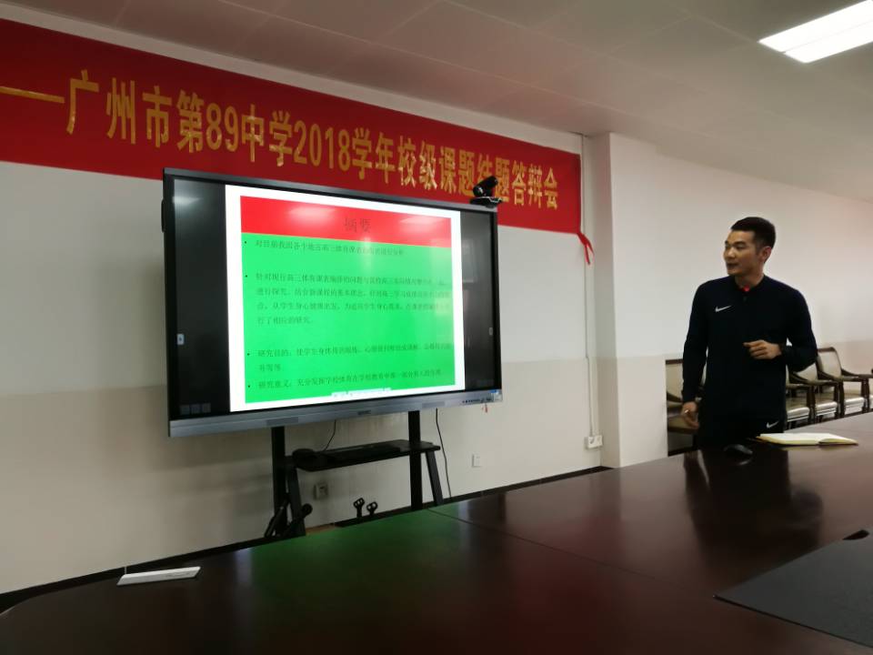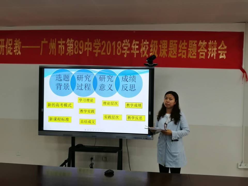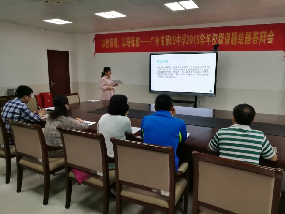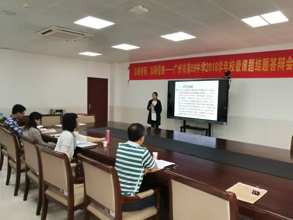 5月10日,广州市第89中学2018学年校级课题结题答辩会在至德楼406会议室举行。会议由科研处副主任王强主持,校级课题评审领导小组副组长唐虹副校长,校级职称评聘专业学术推荐委员会樊嗣鸿组长、蔡永利副组长、余丽媛老师、陈粤老师,雷江田老师参加结题会议并任评审。